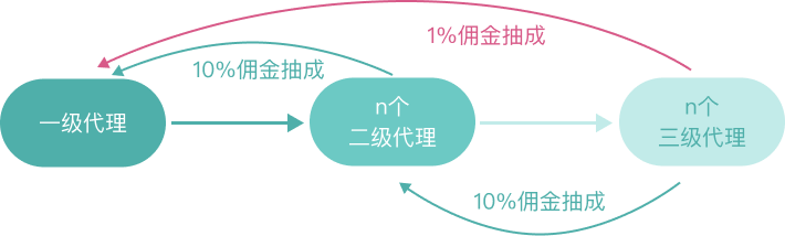 代理商可以推广下级代理,向最多两级的下级代理抽取额外的佣金收入。